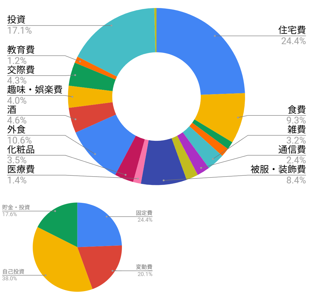 そんなわけで、いつもの月収 + 繰り越した1万円な状態で、変動費20%と自己投資38%は高かったね。