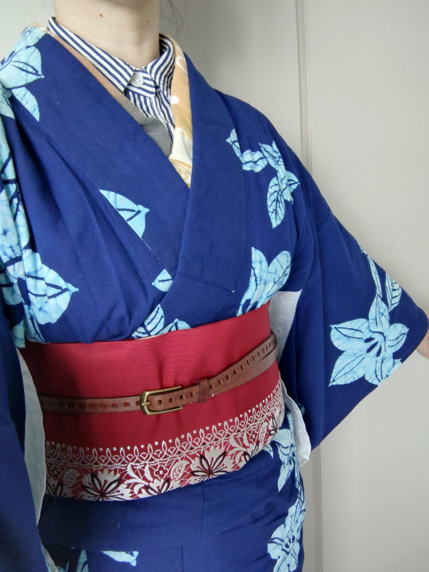 ストライプシャツに、襦袢、浴衣、仕立ててない半幅帯をカルタ結び。